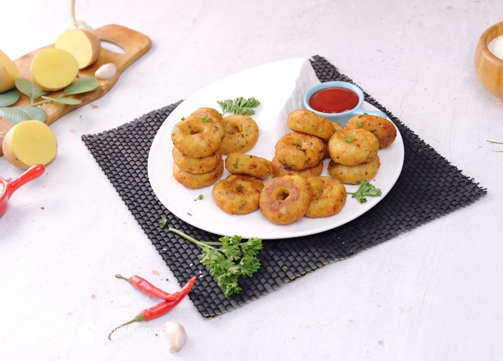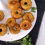 -With greased hands,take a small quantity of mixture (30g),make a ball & press a finger in the center to make a hole to create a donut like shape (makes 35).