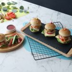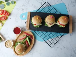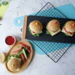 -Mini burger bun ko center mein sa cut ker lein,tayyar burger sauce dal ker pheela lein,salad patta,cheese slice,tamatar slice,pyaz rings,fried chicken nugget,kheera slice,tomato ketchup aur burger sauce dal dein aur top bun sa cover ker ka burger tayyar ker lein (makes 8-10).