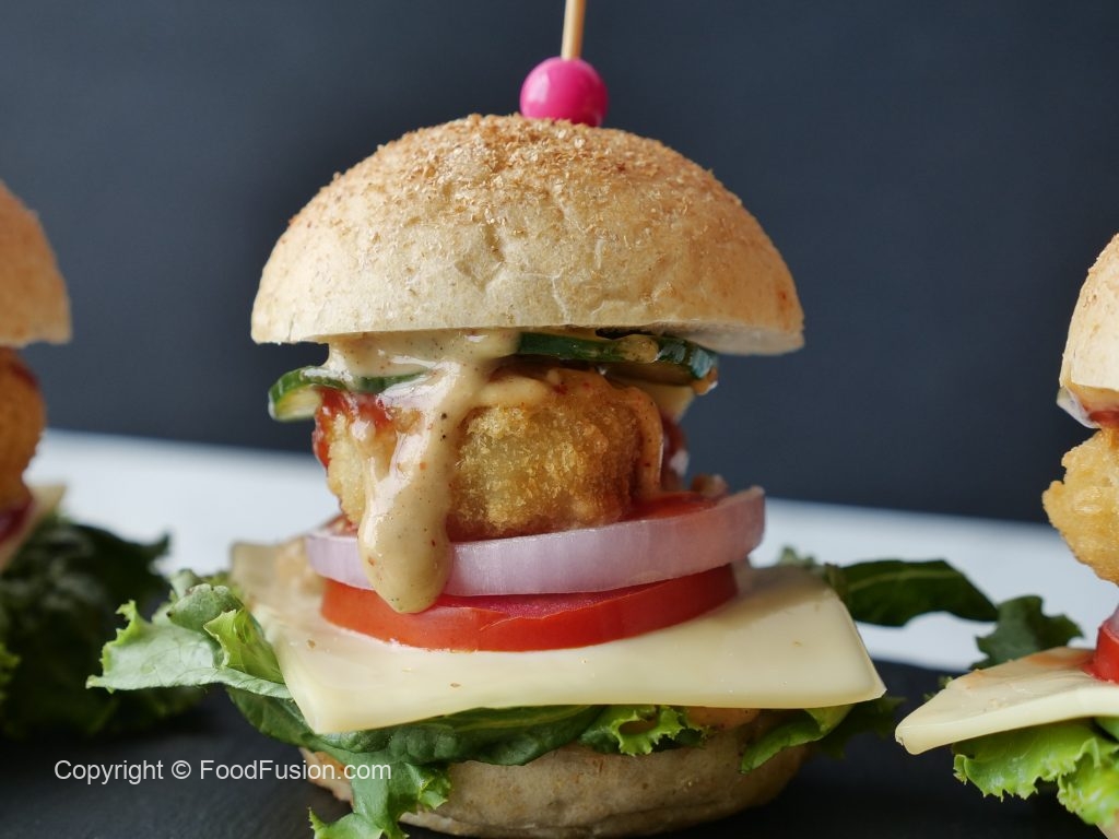 -Cut smini burger buns from center,add & spread prepared burger sauce,lettuce leaf,cheese slice,tomato slice,onion rings,fried chicken nugget,cucumber slices,tomato ketchup,burger sauce and top with another mini bun to make a burger (makes 8-10).