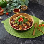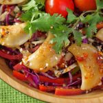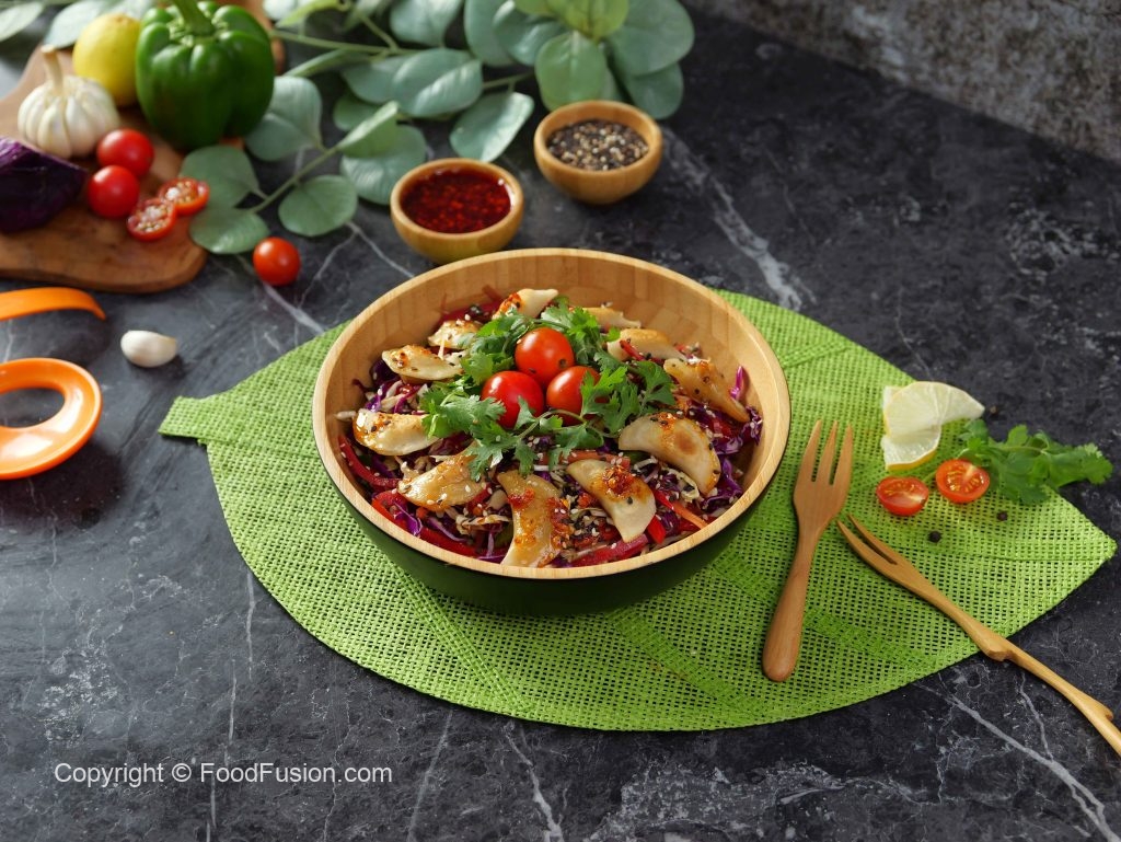 -In a serving bowladd prepared salad,fried dumplings & garnish with fresh coriander,cherry tomatoes, chilli oil,sesame seeds & serve!
