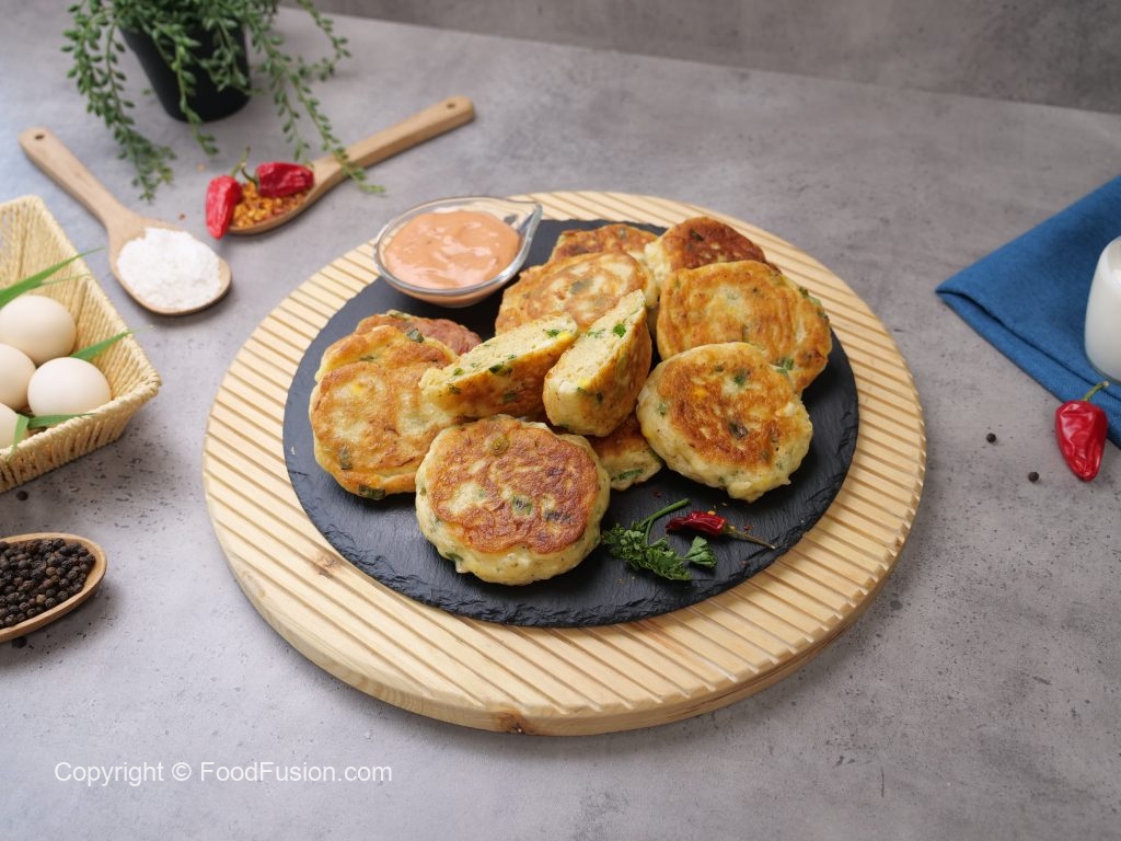 -In a frying pan,heat cooking oil,pipe out prepared mixture & flatten with the help of greased spoon & fry pancakes from both sides on low flame until golden brown.