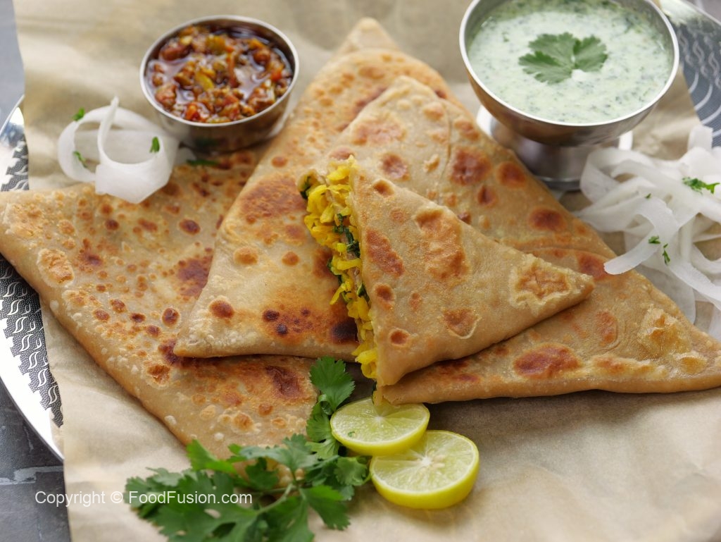 -On a rolled dough,add & spread prepared radish filling,fold one side of the rolled dough,apply water then fold the remaining two sides & make a triangle paratha.