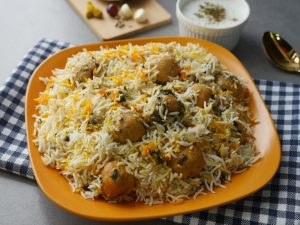 In pot,add half quantity of boiled rice,meat balls with gravy,mint leaves,fresh coriander and remaining quantity of boiled rice.