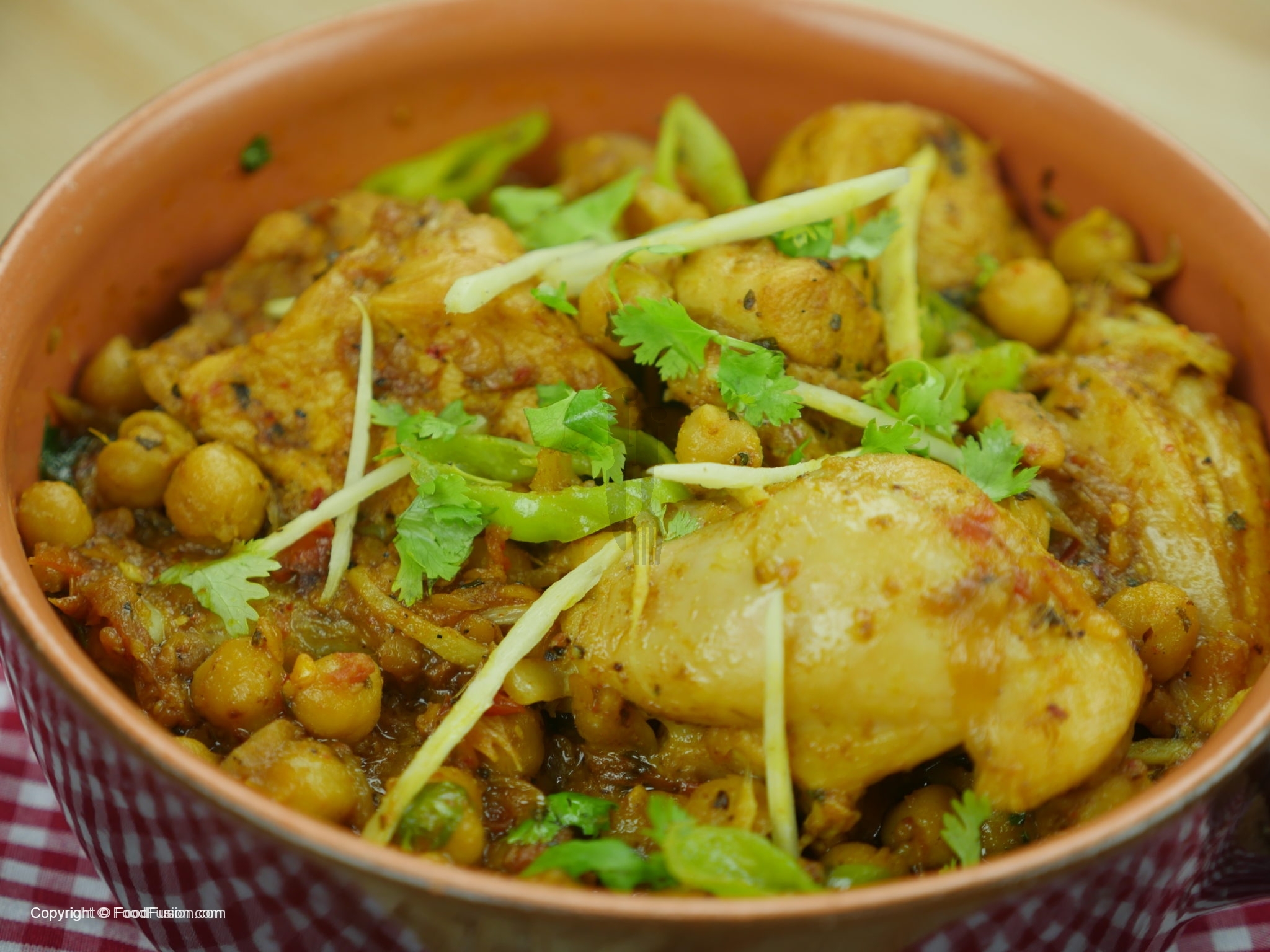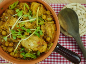 In pan heat oil, add onion and fenugreek seeds fry till light gold. Add tomatoes and when tender add GGP, chicken and red lentils and mix well. Add crushed chilies, coriander powder, turmeric, cumin powder, red chili powder and black pepper. Mix well, add water and salt and cover the lid till chicken is about to done.
