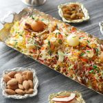 Fried khoya,green colored chawal,red colored chawal aur yellow colored chawal dal dein.
