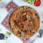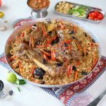 -Add 2 tbs of prepared bukhari spice mix,pink salt,mix well & cook on high flame until 1 cup of stock is left (4-5 minutes),add carrots & black raisins,chickpeas,place cooked mutton pieces & cover with kitchen cloth & lid.