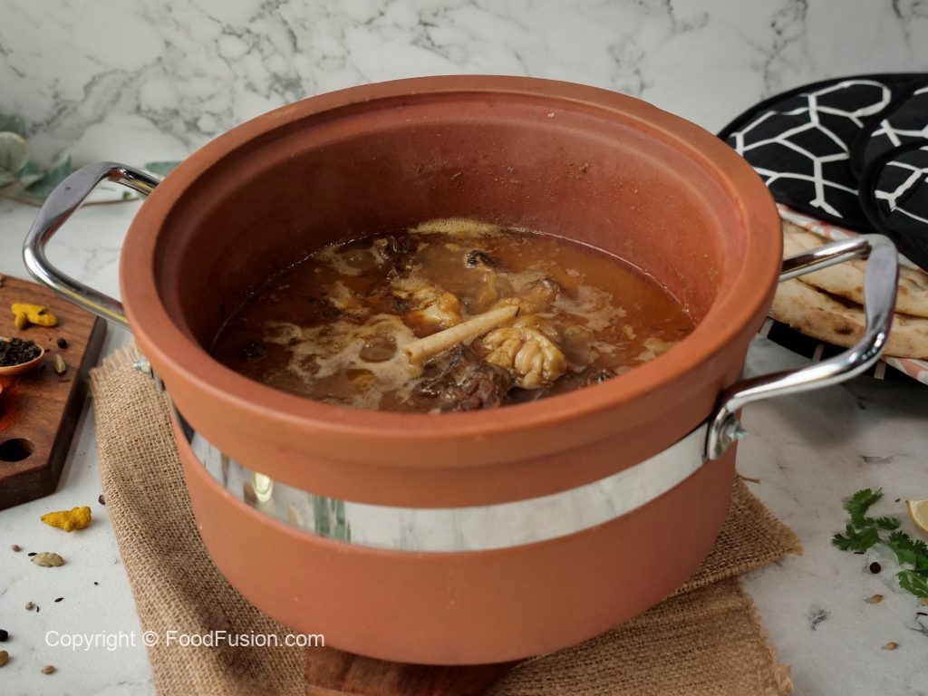 In mutton trotters,add salt,black cardamom,cloves,black peppercorns,cinnamon sticks,bay leaf,ginger garlic paste,hot water and mix well,bring it to boil,cover and cook on low flame until tender (2-3 hours) 3 cups of water should be left.