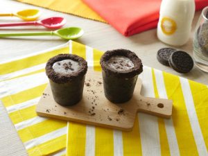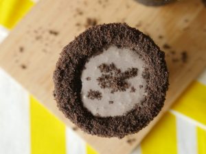 Oreo shots ko molds mein sa nikal lein aur oreo shots glasses ki rims ko cream mein dip ker ka crumbled oreo biscuits mein coat ker lein.