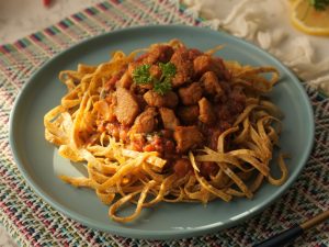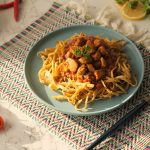 -Serving plate mein tayyar egg noodles,marinara sauce aur cooked chicken dal ker serve karein!