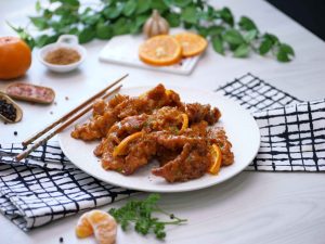 -In a wok,add lemon & orange juice (1 Cup),brown sugar,remaining spice mix (1 tbs),lemon zest (1/4 tsp),orange zest (1 tsp),cornflour & whisk well.