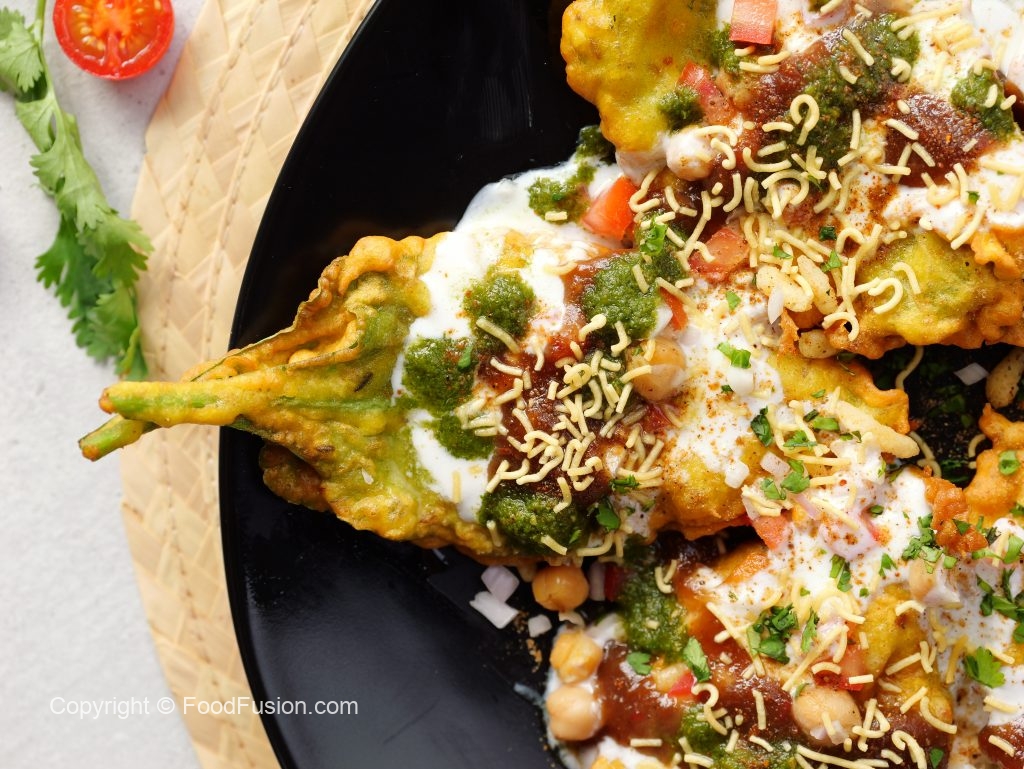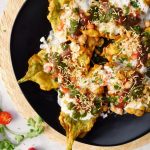 -Assemble fried palak patta on a platter,add chickpeas,bareek boondi,tomato,onion,yogurt,khatti meethi chutney,green chutney,sprinkle chaat masala,nimco sev & fresh coriander & serve!