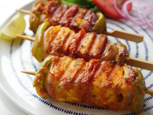 Paneer cubes aur vegetables ko skewers per laga lein (makes 10-12).