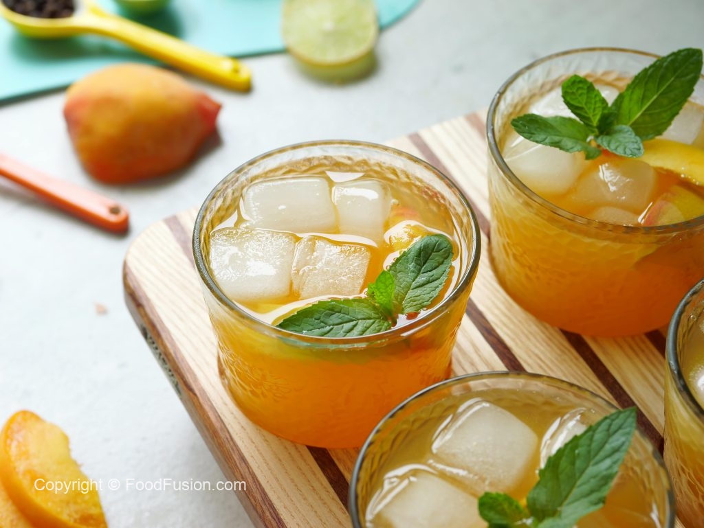-Serving glass mein ice cubes,peach slices,tayyar peach drink aur podina dal kar serve karein!