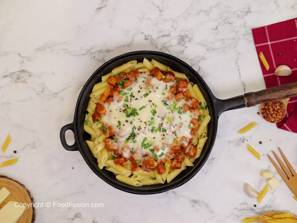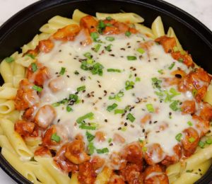 In a cast iron pan,add penne pasta,cooked chicken,mozzarella cheese,spring onion leaves,black & white sesame seeds,cover & cook on low flame until cheese melts (4-5 minutes).