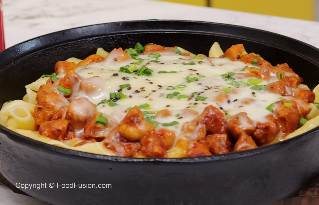 Cast iron pan mein penne pasta,cooked chicken,mozzarella cheese,hara pyaz aur black & white til ker dhak dein aur halki ancch per cheese melt ho janay tak paka lein (4-5 minutes).