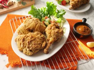 Crispy air fried chicken ko sauce & salad ka sath serve karen.