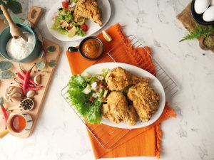 Serve crispy air fried chicken with sauce & salad.