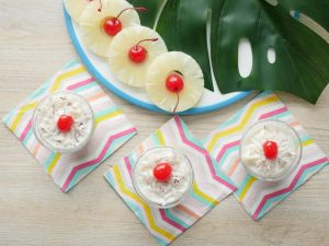 Sprinkle fresh coconut and top with cherry.