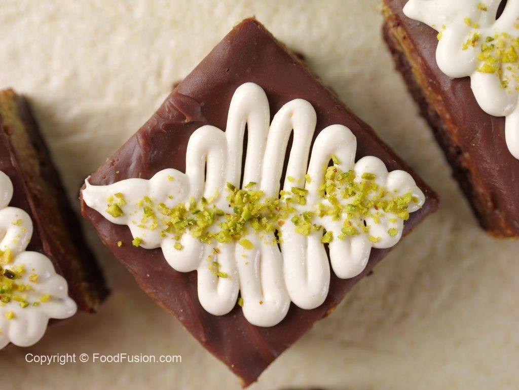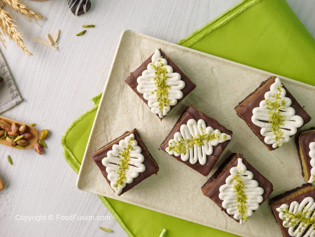 -Cut into pieces & decorate with white chocolate ganache,pistachios & serve!