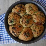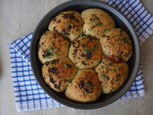 Apply garlic herded butter and bake in preheated oven at 180 C for 20-25 minutes.