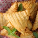 -Apply flour slurry,make a pocket,add mince filling in the centre & roll into the shape of samosa and seal corners with all-purpose flour slurry (makes 12-14).