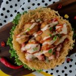 In a wok,heat cooking oil and fry potato nest on low flame until golden & crispy (press down with another sieve to hold shape).