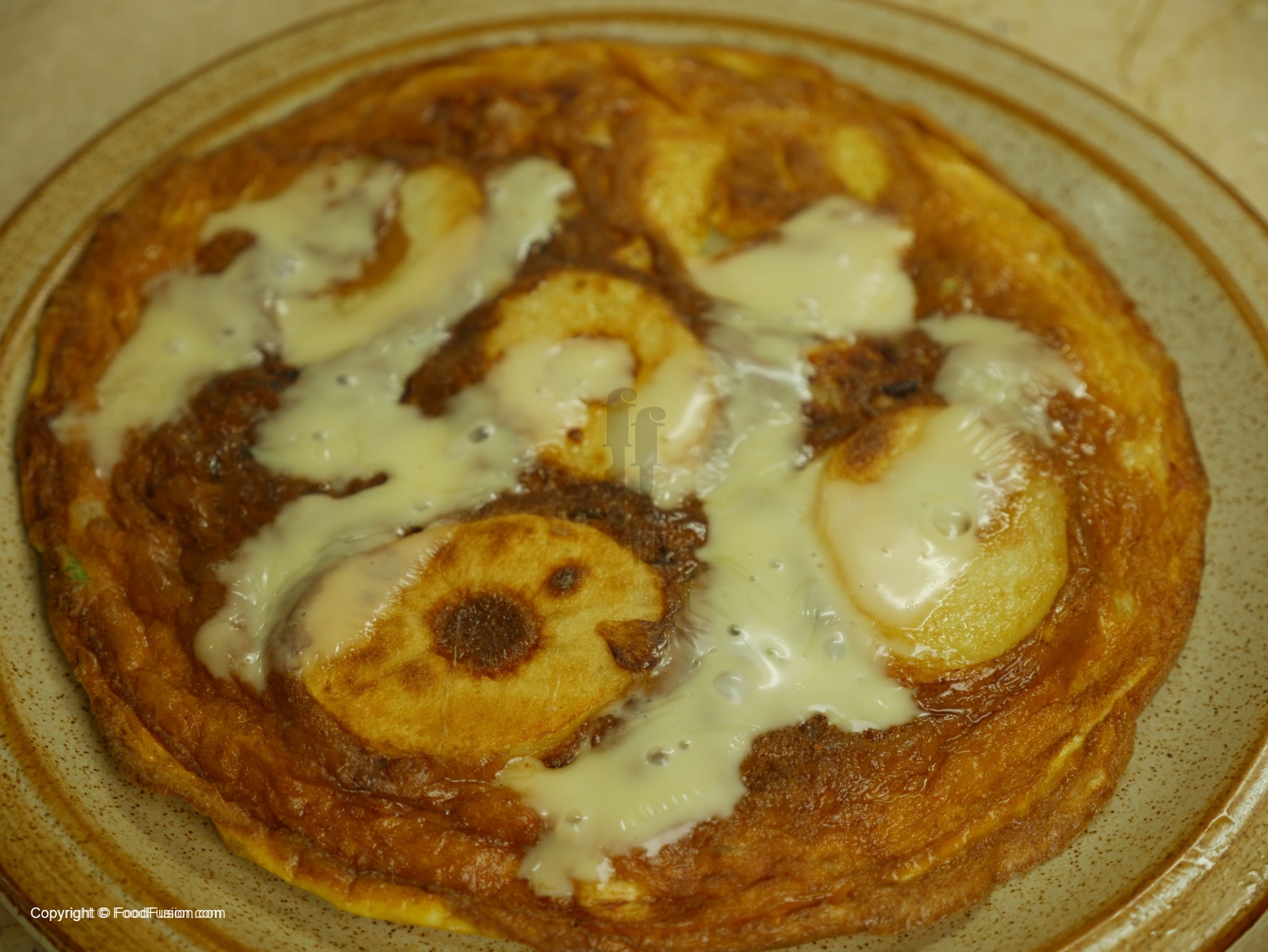 Now pour egg mixture on fried potato and let it cook for 5 minutes then flip the egg.