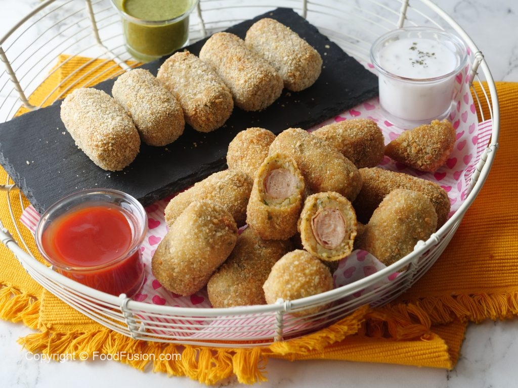 -Ab fried sausage rakh dein aur aloo mixture sa cover ker lein & ek jaisay sizes ka croquettes tayyar ker lein.