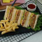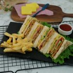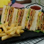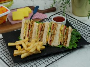 Bread slice mein pulled chicken dal ker pheela lein,kheera slices aur tamatar slices dal dein, another toasted bread slice rakh dein,tomato ketchup,ice berg,tayyar anda aur chedder cheese slice rakh ker upper sa toasted bread slice rakh dein (makes 4-5 sandwiches).