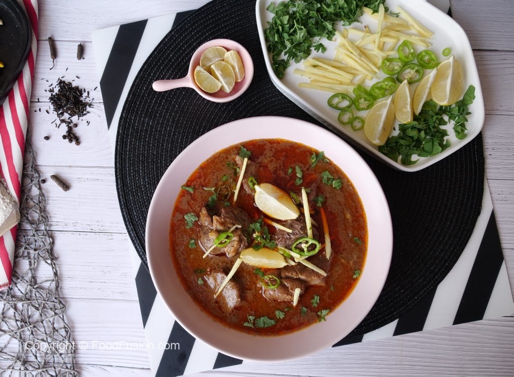 Serving dish mein nihari,chilli oil (tarri),adrak,hari micrhein,hara dhania aur lemon dal ker serve karein!