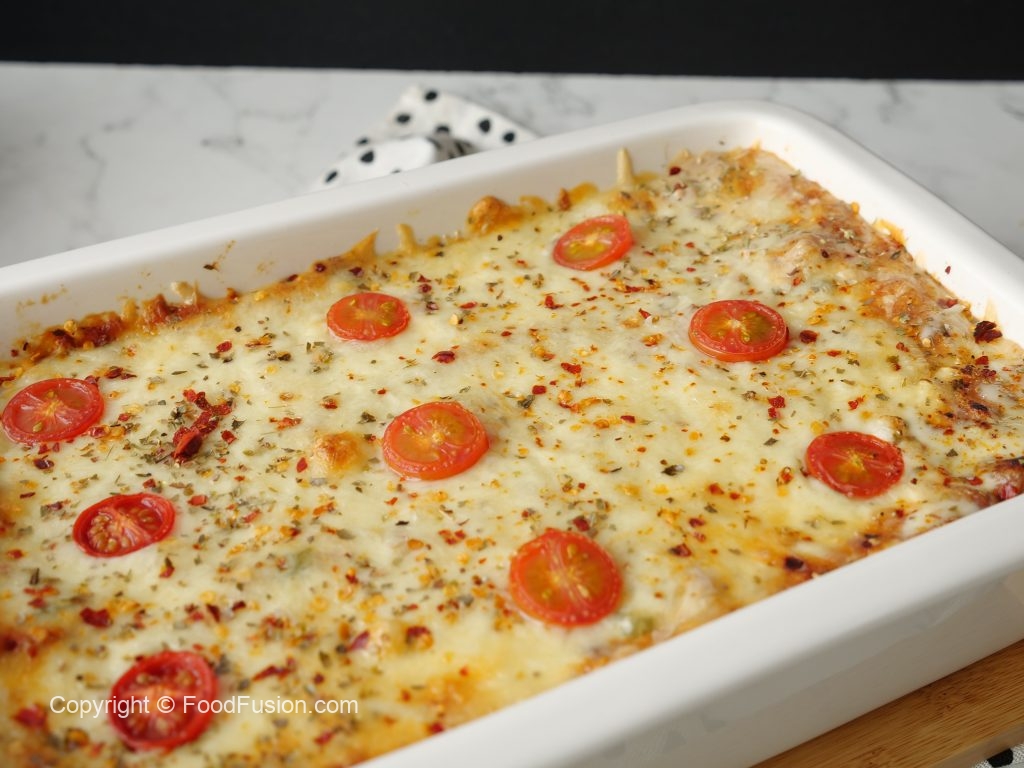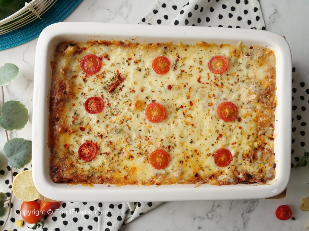 -In 10 x 6 inch baking dish,add & spread prepared red sauce,lasagna sheets,red sauce,prepared vegetable white sauce,mozzarella cheese,cheddar cheese,lasagna sheets,red sauce,vegetable white sauce,mozzarella cheese,cheddar cheese,lasagna sheets,red sauce,vegetable white sauce,mozzarella cheese,cheddar cheese,sprinkle red chilli crushed,dried oregano & garnish with cherry tomatoes.
