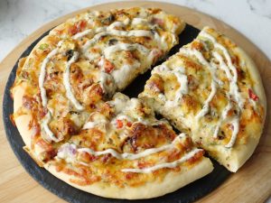 Add & spread ranch sauce 3-4 tbs,cheddar cheese,mozzarella cheese,cooked chicken,capsicum,onion, tomatoes,mushrooms,black olives,cheddar cheese,mozzarella cheese,dried oregano & red chilli crushed (makes 3 medium Pizzas).