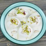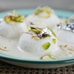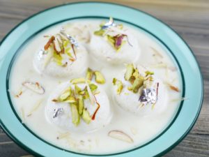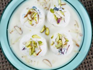 Place cheese balls on serving plate, pour sweet milk (rabri).