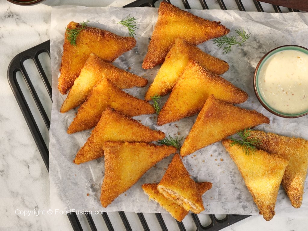 -First, dip samosa in whisked eggs, then coat evenly in bread crumbs.