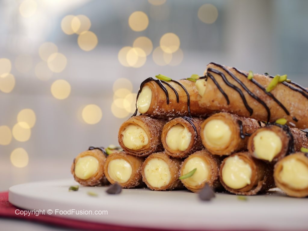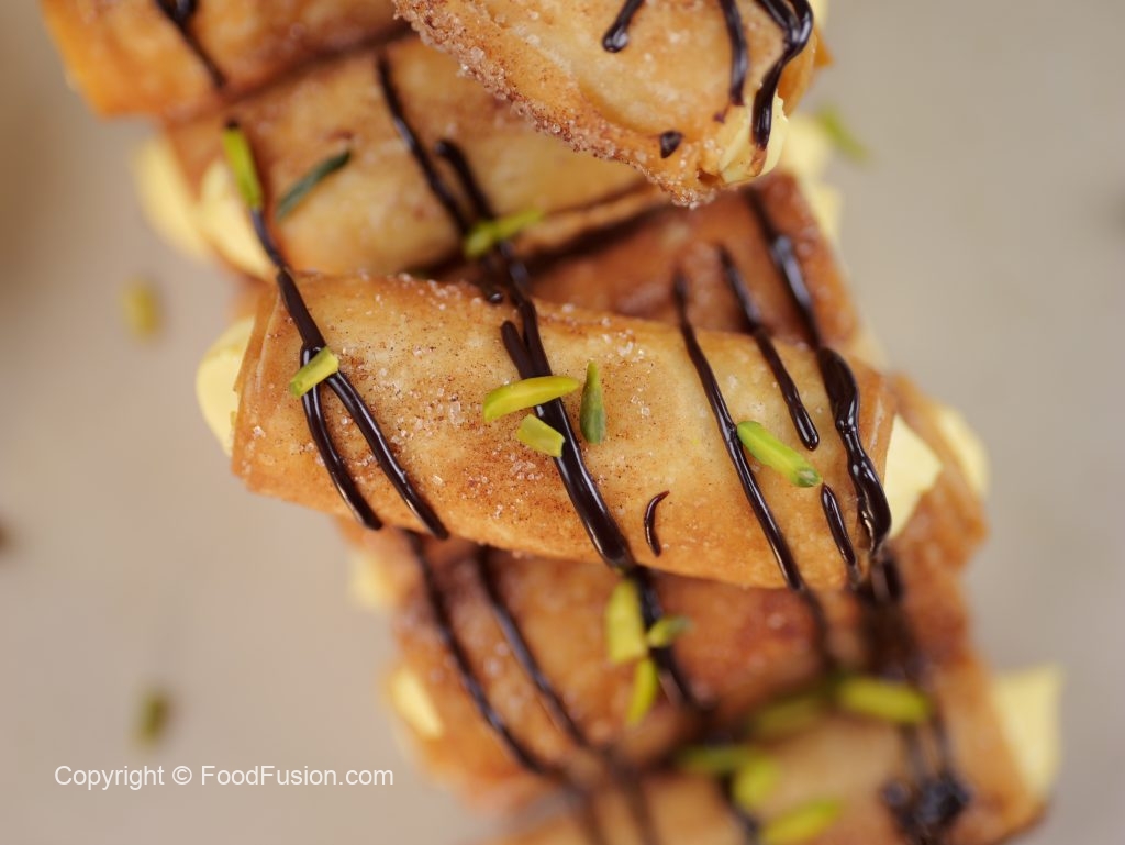 -Pipe out prepared creamy custard in the cinnamon sugar-coated samosa rolls.