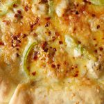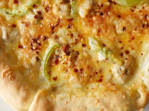 Mozzarella cheese,cooked chicken,mushrooms,pyaz,lal mirch crushed,cheddar cheese,shimla mirch aur mozzarella cheese dal ker lal mirch crushed sprinkle ker lein (makes 2 large pizza).