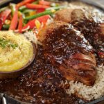 -Garlic fried rice,stir fried vegetables,creamy mashed potato,chicken fillets,garlic & pepper sauce dal ker serve karein!