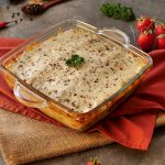Lasagna sheets,red sauce,smoky chicken,white sauce,lasagna sheets,red sauce,cheddar cheese,mozzarella cheese dal dein,dried oregano aur lal mirch crushed chirak dein.