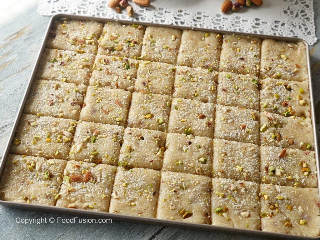 Ab isko greased tray main set karlen aur 1 hour rest kar len phir uper khopra, pista aur badaam sprinkle karke squares cut kar len.