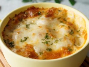In baking dish,add egg coated macaroni,prepared cheese sauce,fresh parsley,chicken crispy shots,prepared cheese sauce,cheddar cheese,mozzarella cheese and fresh parsley.