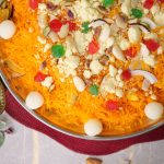 -Garnish with khoya,tutti fruiti,almonds,pistachios,dried coconut,cham cham & serve!