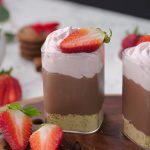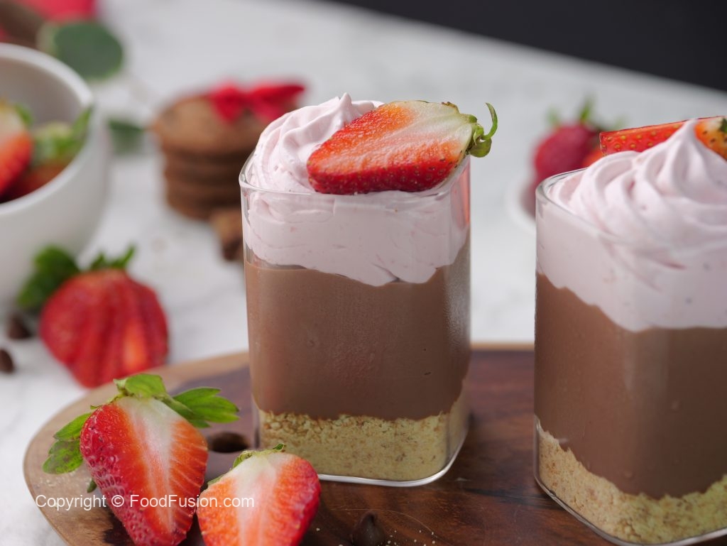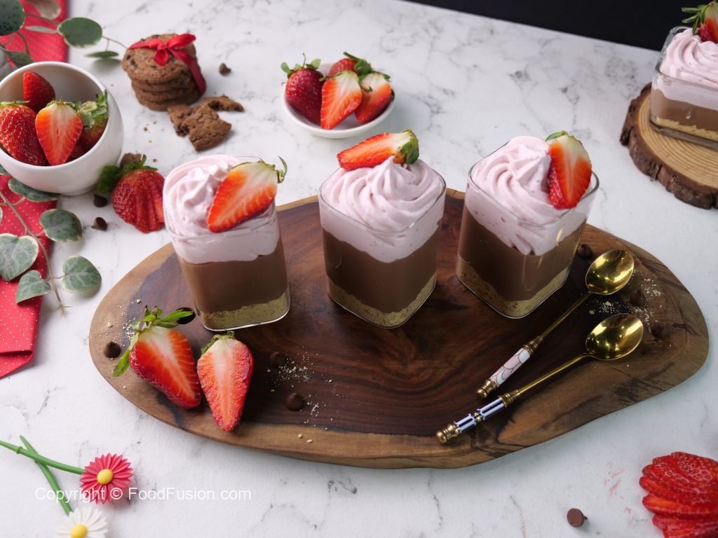 -Serving glass mein crushed biscuits,tayyar chocolate pudding & strawberry cream dal dein.