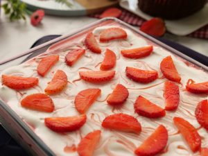 In a serving dish,add & spread strawberry cream,layer ladyfinger biscuits on top then cover with a layer of olper’s whipped cream (reserved) & spread evenly.