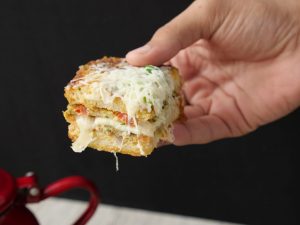 -Cheddar cheese slice,grated mozzarella cheese aur chaat masala dal dein aur dosray bread slice sa cover ka sandwich tayyar ker lein.