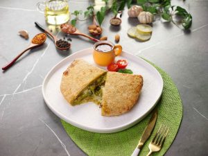 -Add prepared pesto & spread on half side,add mozzarella cheese,baby spinach,sun-dried tomatoes, fold,seal properly & coat with breadcrumbs.