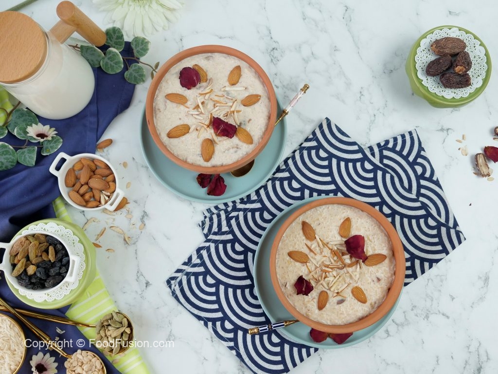 Add dry dates,raisins,almonds and melon seeds,mix well & bring it to boil,cover partially & cook on low flame until 40% milk is reduce (25-30 minutes) then mash well to desired consistency with the help of wooden masher.
