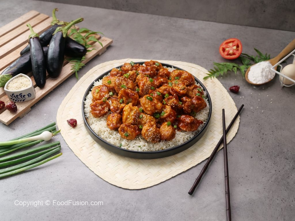 -In a wok,heat cooking oil,dip eggplant slices in prepared batter & fry on medium flame until golden & set aside.