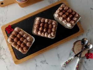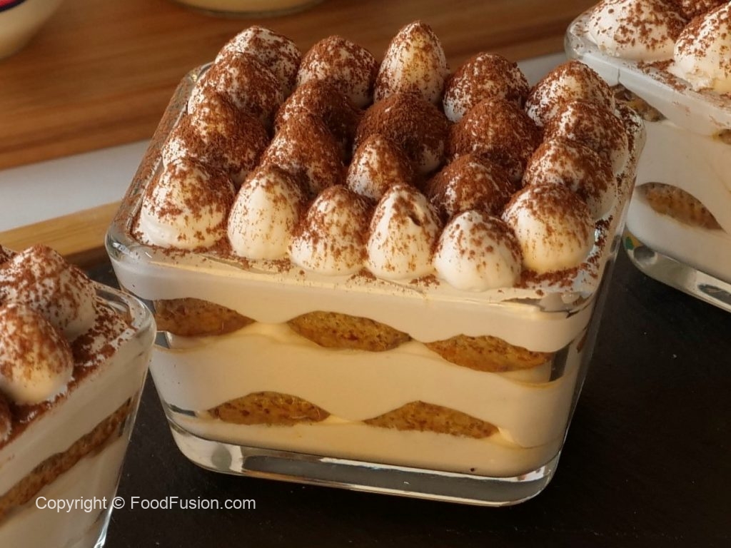 Serving cups mein tayyar cheese & cream mixture ki layer laga lein,coffee dipped biscuits ek ek ker ka rakh dein aur ek aur layer cheese & cream mixture ki laga lein aur cocoa powder sprinkle ker lein.