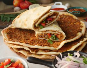 Lahmacun ko pyaz,tamatar,hara dhania aur lal mirch crushed ka saath serve karein!