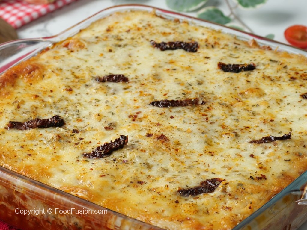 -In baking dish,add & spread pizza sauce,place lasagna sheets,pizza sauce,prepared tuscan chicken sauce,cheddar,cheese,mozzarella cheese,lasagna sheets,pizza sauce,prepared tuscan chicken sauce, cheddar cheese,mozzarella cheese,lasagna sheets,pizza sauce,prepared tuscan chicken sauce, cheddar cheese,mozzarella cheese,dried oregano,red chilli crushed & sundried tomatoes.
